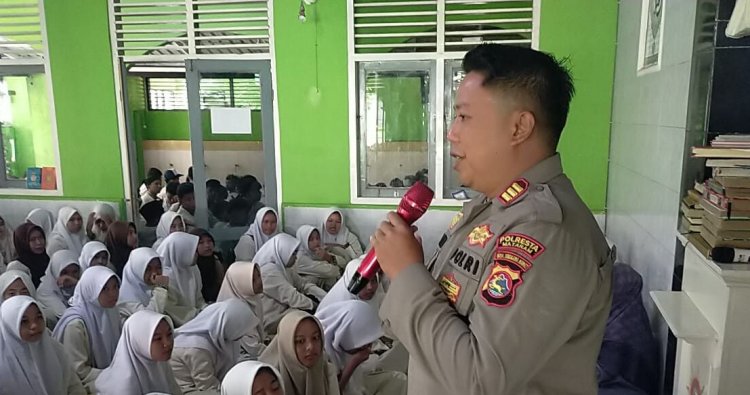 Kapolsek Ampenan saat menyampaikan Himbauan Kamtibmas sekaligus Sosialisasi SMA Kemala Taruna Bhayangkara di SMPN 10 Mataram, Jumat (28/11/2025)