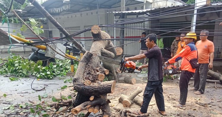 Pohon jenis waru dilaporkan tumbang akibat curah hujan tinggi yang disertai angin kencang. Batang pohon menutup hampir seluruh badan jalan sehingga arus lalu lintas sempat terganggu.